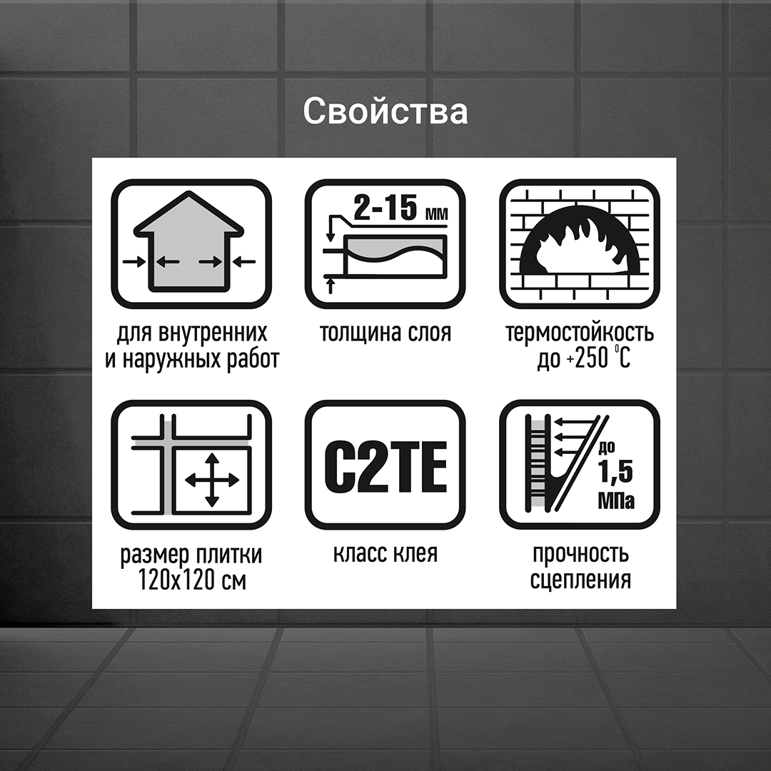 Термостойкий плиточный клей для различных нагреваемых поверхностей: системы «Тёплого пола», внешних поверхностей печей и каминов. Клей обеспечивает надежное клеевое соединение при постоянном воздействии температуры +150 °С и выдерживает кратковременный нагрев до +250°С.