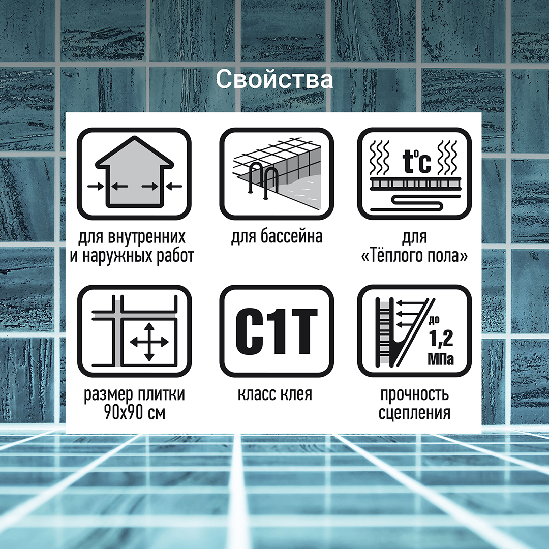 Для укладки керамической, керамогранитной, мозаичной и стеклянной плитки, стеклоблоков, плит из природного камня на пол и стены в любых помещениях: влажных, сухих, промерзающих и отапливаемых. Также подходит для наружной облицовки зданий.